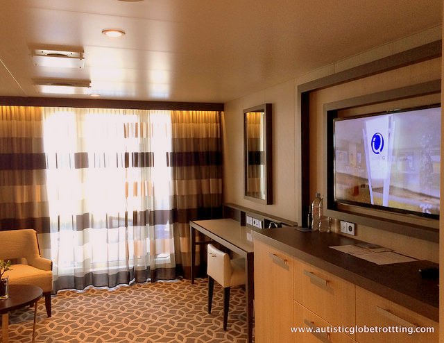 Passengers shouldn’t hesitate to ask the cabin steward to help rearrange the furniture in the cabin if necessary. The best layout that leaves the most space is splitting the king size bed into two singles to create a pathway between the beds.